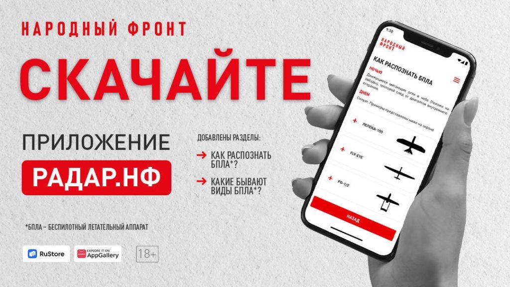 Мобильное приложение «Радар.НФ» создано Общероссийским общественным движением «Народный фронт «ЗА РОССИЮ» в 2023 году для помощи людям быстро сообщать о подозрительных объектах – беспилотниках, взрывах, ракетах и других возможных угрозах.